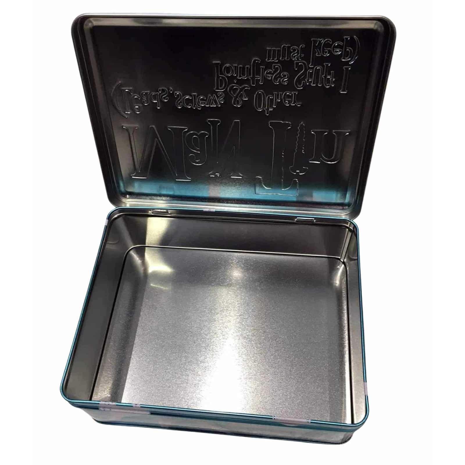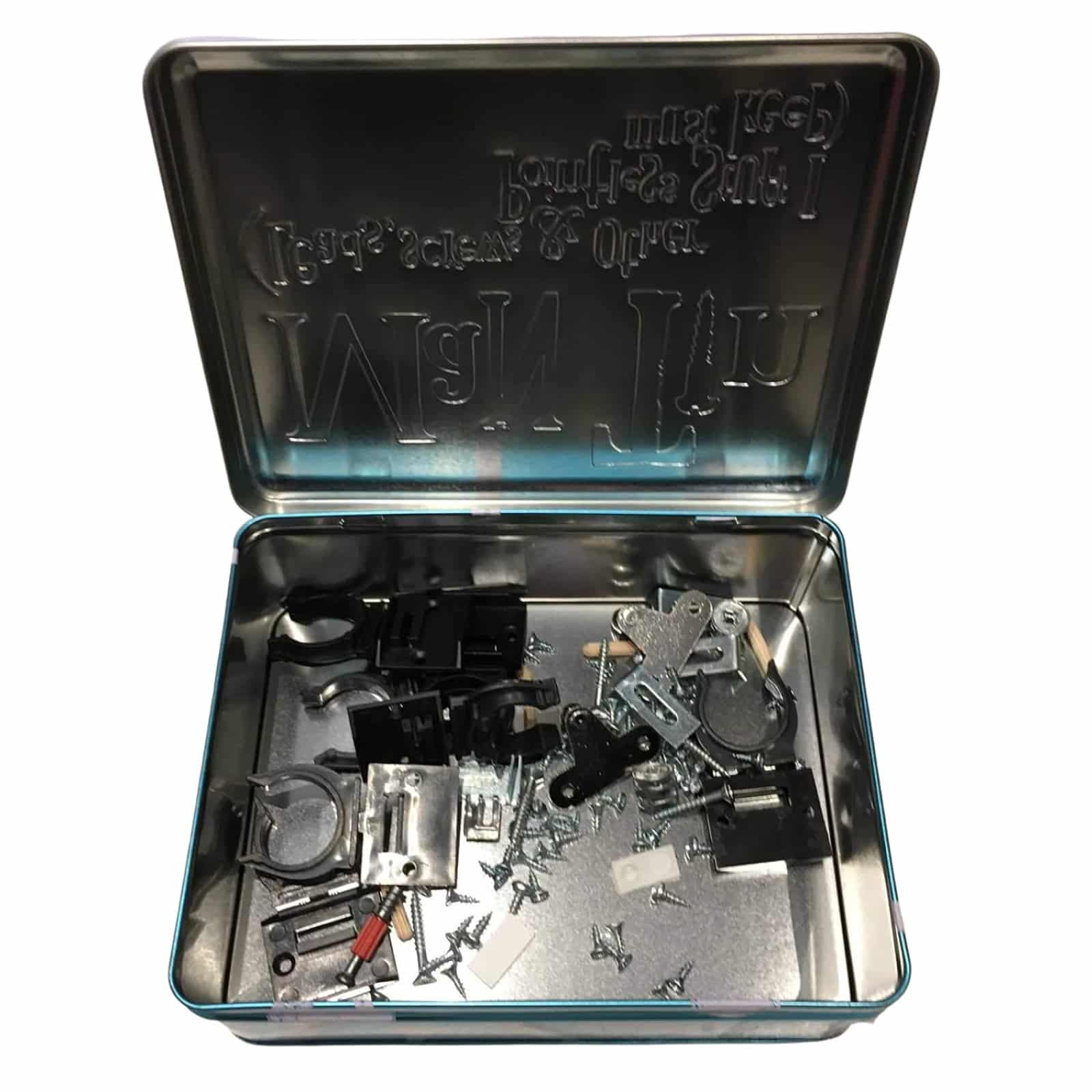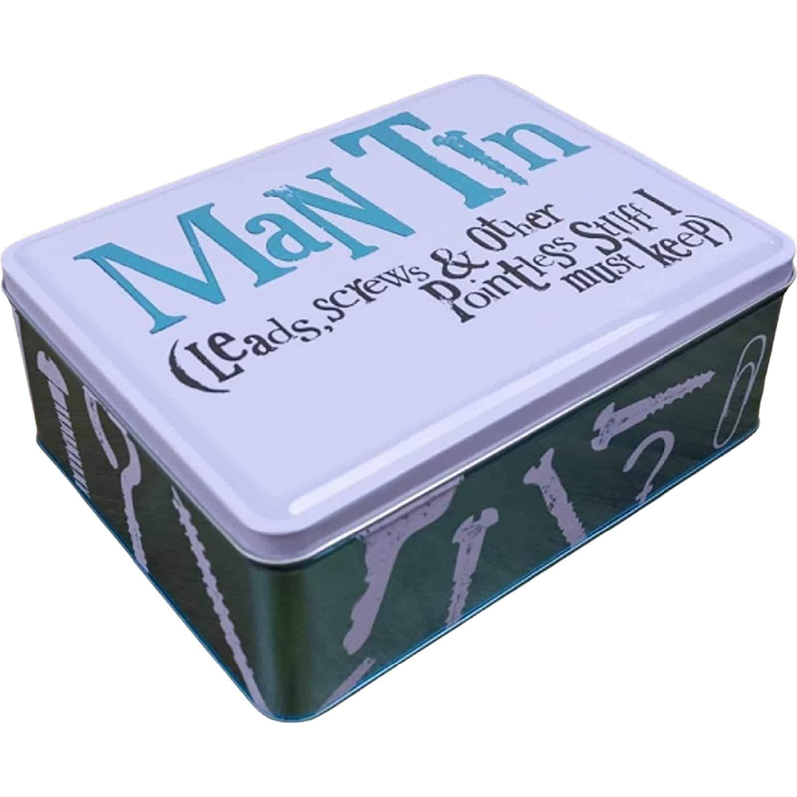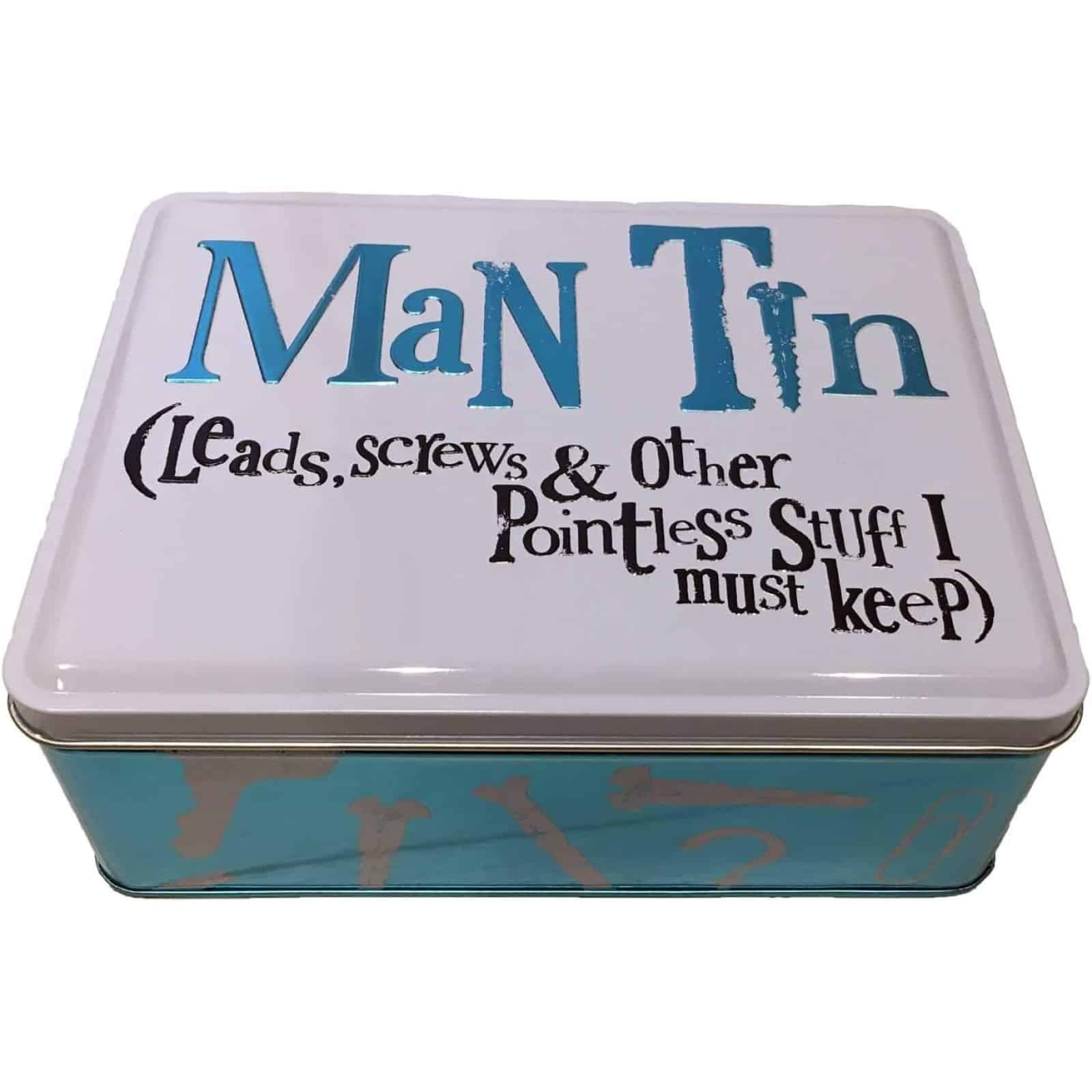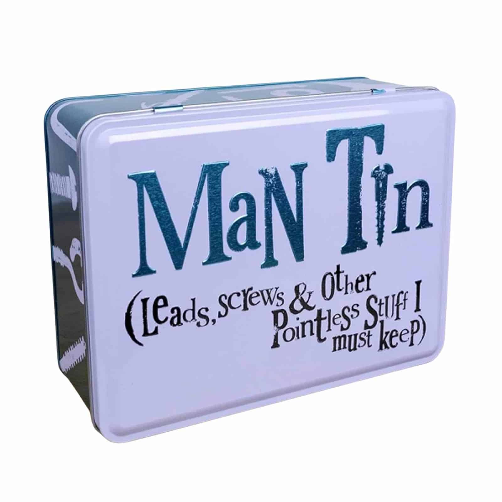 • Humorous Embossed Text: Reads “Man Tin (Leads, screws & other pointless stuff I must keep)” on the lid and “Where allen keys go to die” underneath, adding a playful touch to organisation.
